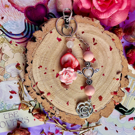 angel rose bag charm / keyring ~ rose quartz & strawberry quartz