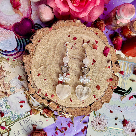 clear quartz & rose quartz bow pearl earrings ~ sterling silver on 925 hooks