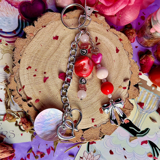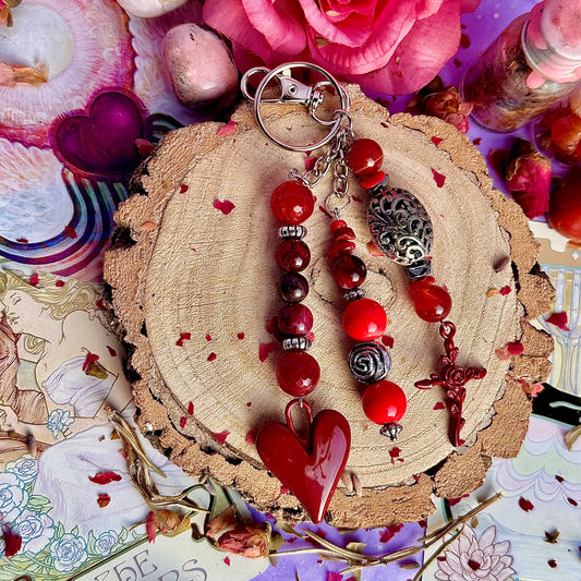 red heart bag charm / key ring ~ carnelian, mookite, red jasper, hematite, coral