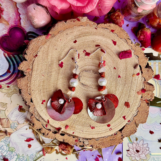 moonstone & red jasper pearl shell earrings ~ sterling silver on 925 hooks