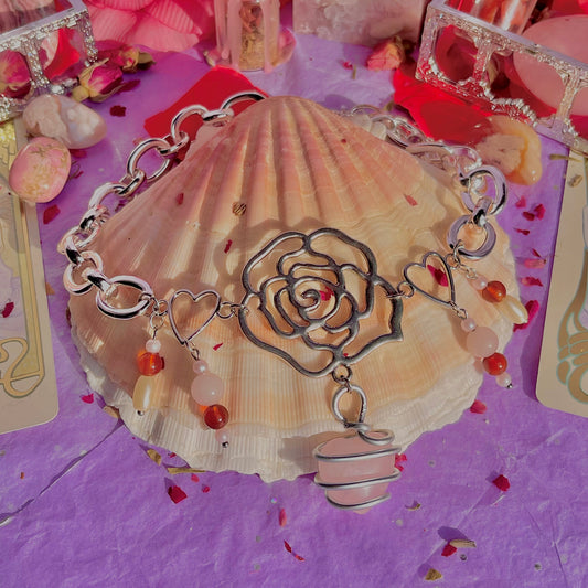 single rose chunky stainless steel necklace ~ rose quartz, carnelian & faux pearls