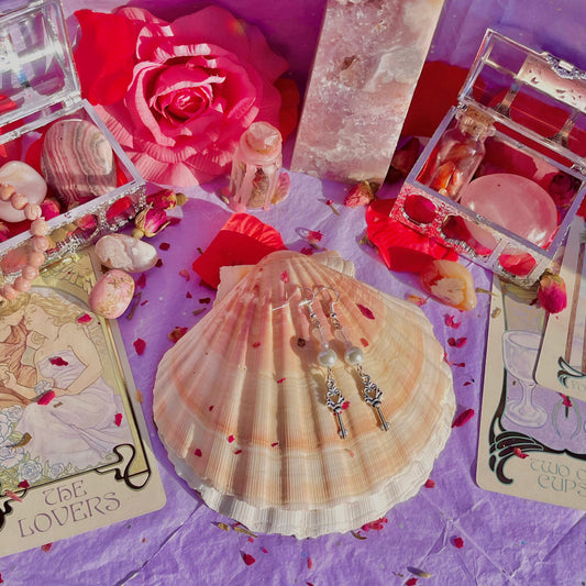 key to my heart earrings on 925 sterling silver hooks ~ rose quartz with faux pearls