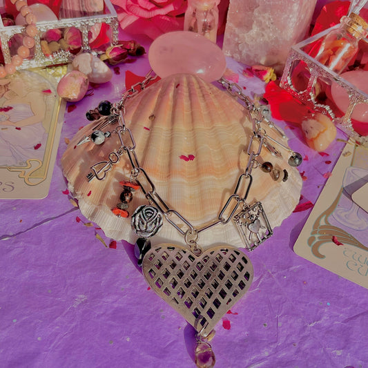 all pieces are made with either 925 sterling silver, silver plated and stainless steel chains, findings and charms; with also recycled beads/charms from thrifting and donations from friends/family as well as of course all genuine top quality crystal beads, pendants and wire wrapped crystals!