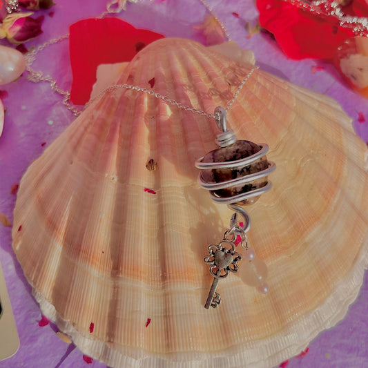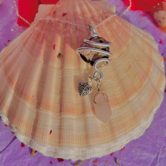 wrapped around my heart necklace sterling silver plated 18 inch chain ~ rhodonite & rose quartz