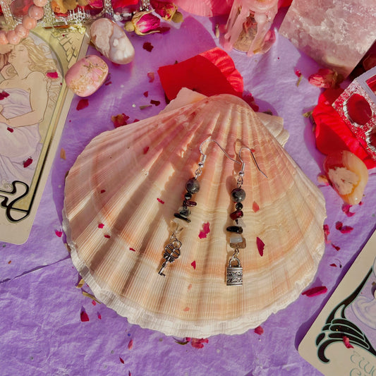 locked heart earrings on 925 sterling silver hooks ~ larvikite, snowflake obsidian, garnet, tourmalinated quartz, black obsidian, black moonstone & smokey quartz
