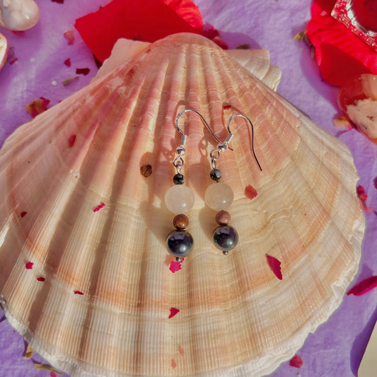 protected love earrings on 925 sterling silver hooks ~ snowflake obsidian, morganite, rhodonite & hematite