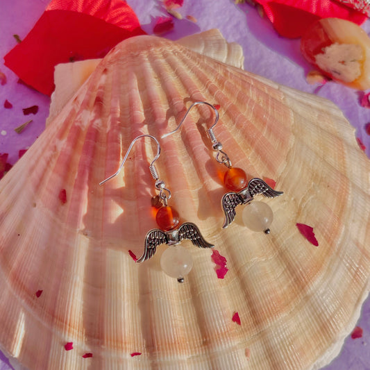 cherub earrings on 925 sterling silver hooks ~ carnelian & rose quartz