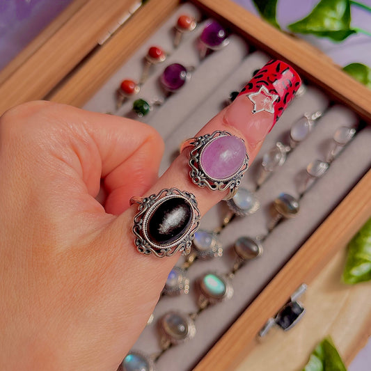 kunzite & silver sheen obsidian ~ 925 sterling silver adjustable rings / choose your own