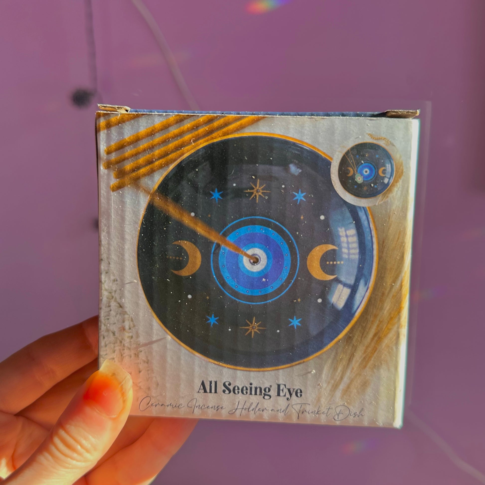 Add a mystical accent to any space with this dark blue incense holder featuring an all seeing eye print surrounded by crescent moons and stars. Perfect for catching ash from incense sticks or doubling as a trinket dish for jewellery and other small treasures.