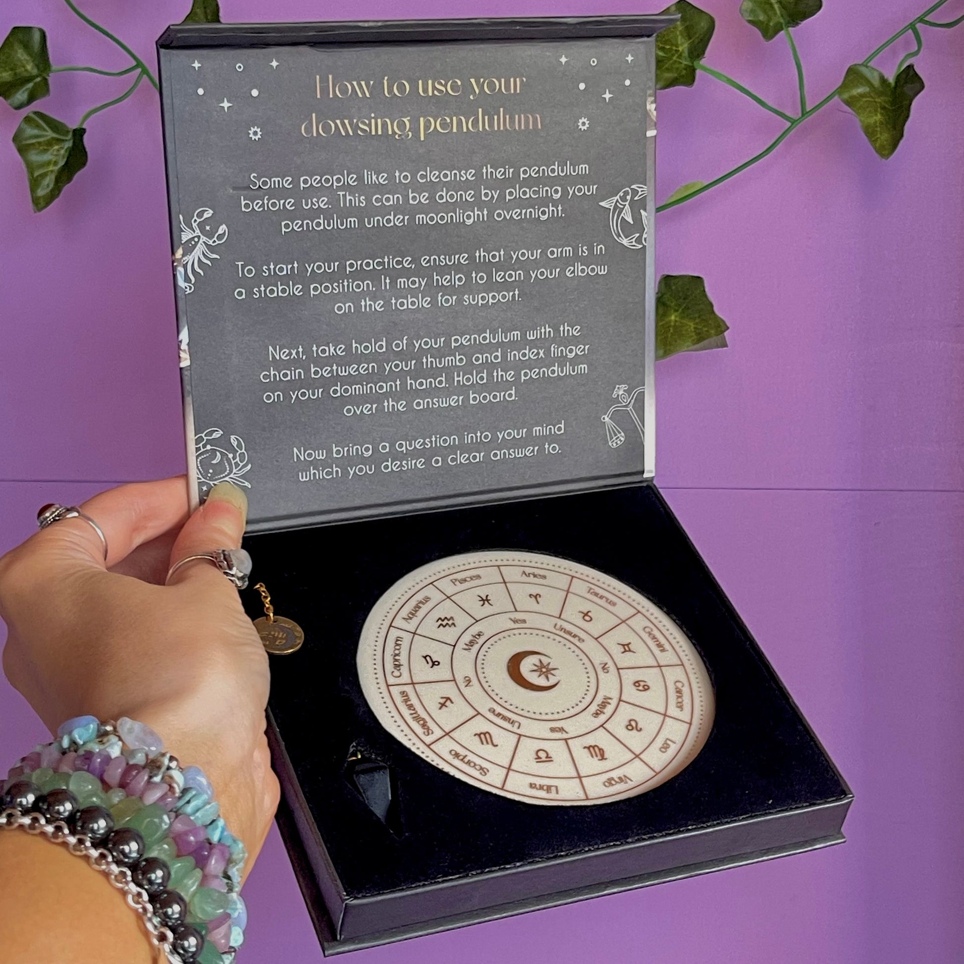 Discover the art of divination and see if the answers to life's questions are written in the stars with this astrology wheel divination kit. Containing a ceramic dish with a gold-effect astrology wheel design and a black obsidian crystal pendulum, this beautiful set is perfect for beginners and experienced soothsayers alike.