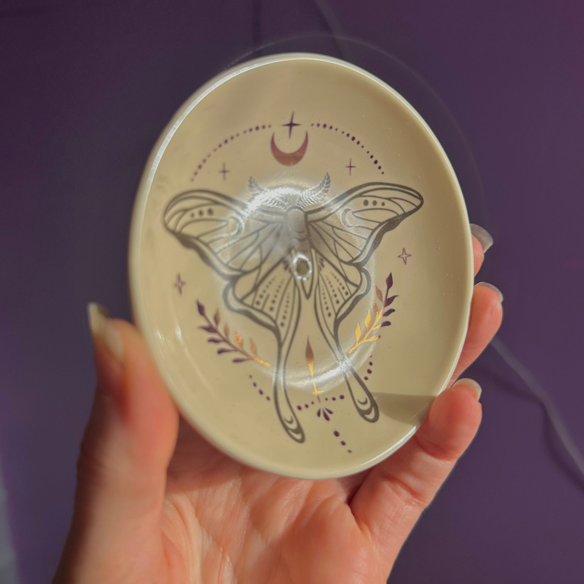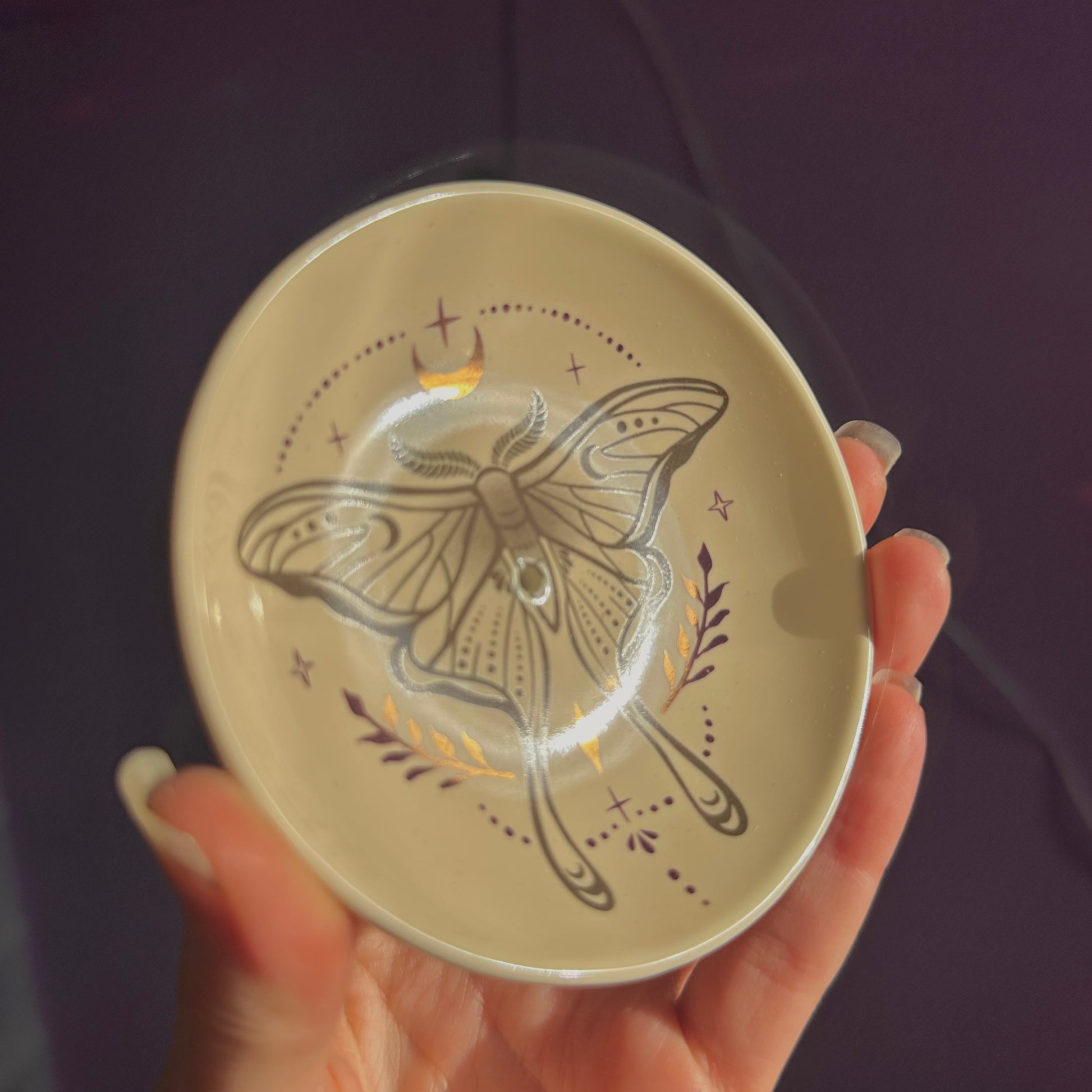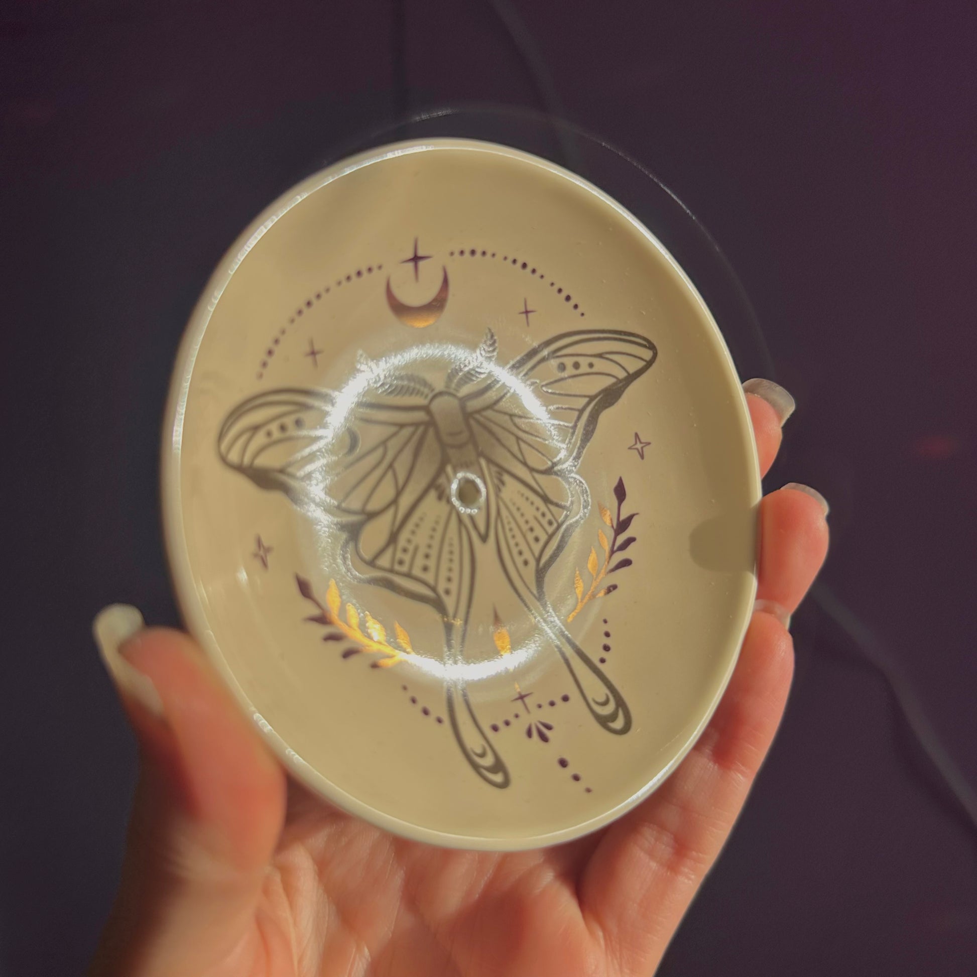 Perfect for adding an ethereal touch to any space, this incense dish is adorned with an elegant luna moth design. The holder is thoughtfully designed to accommodate both incense sticks and cones, featuring a small hole in the centre for sticks and a flat stable surface for burning cones.