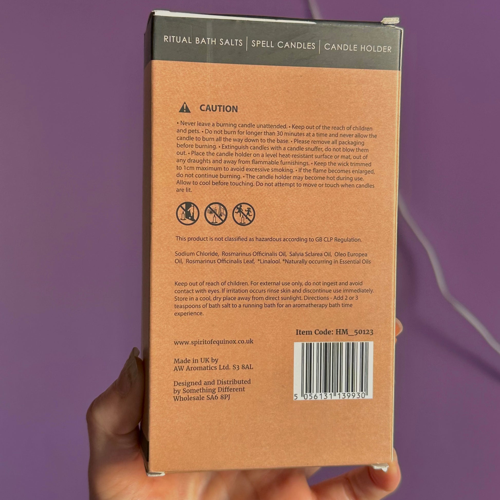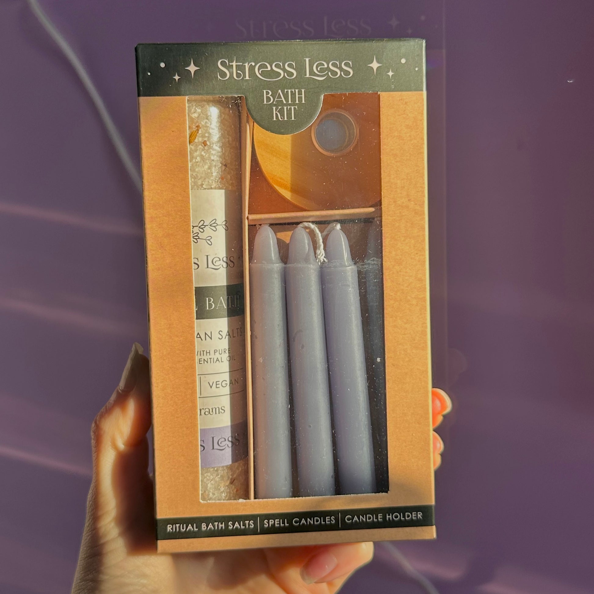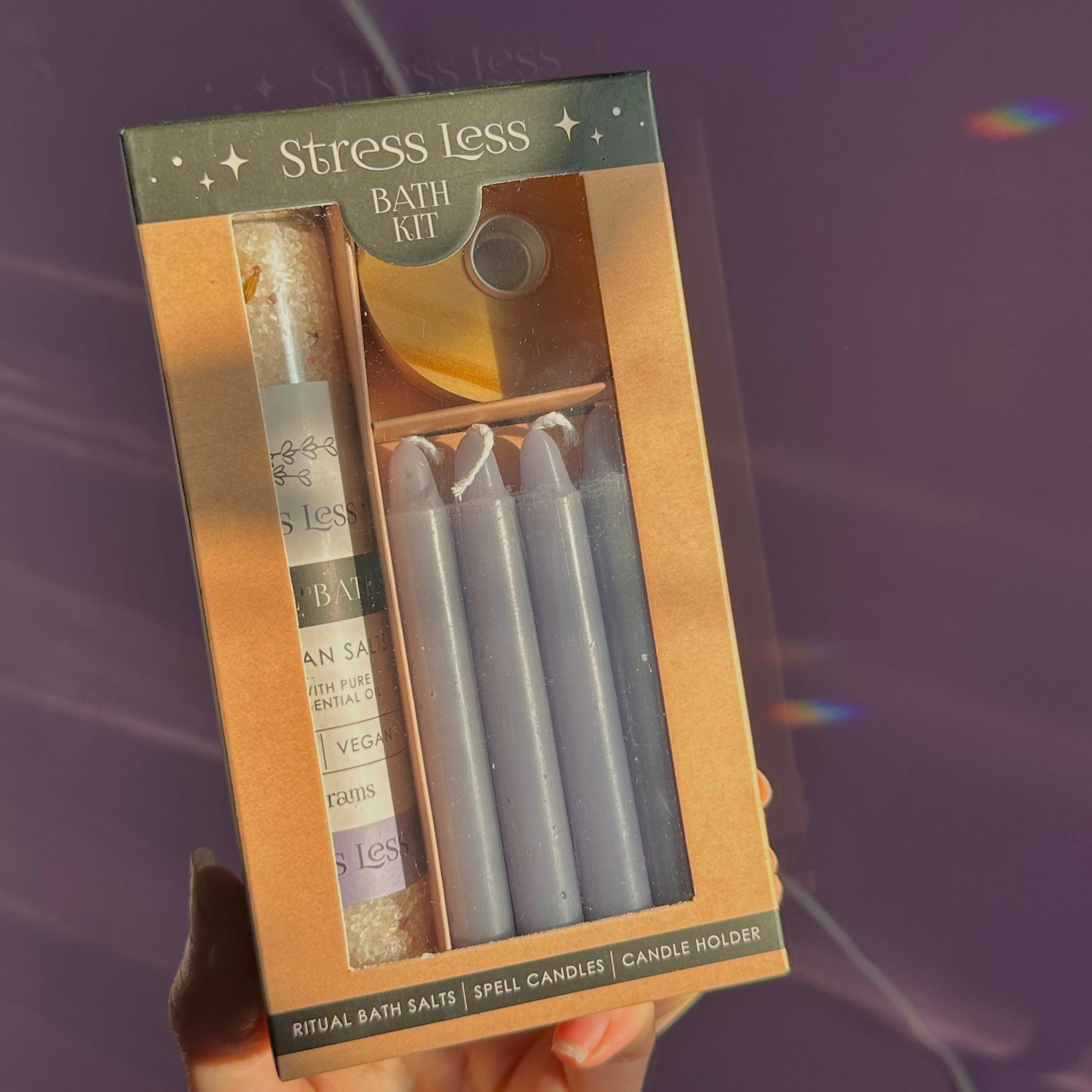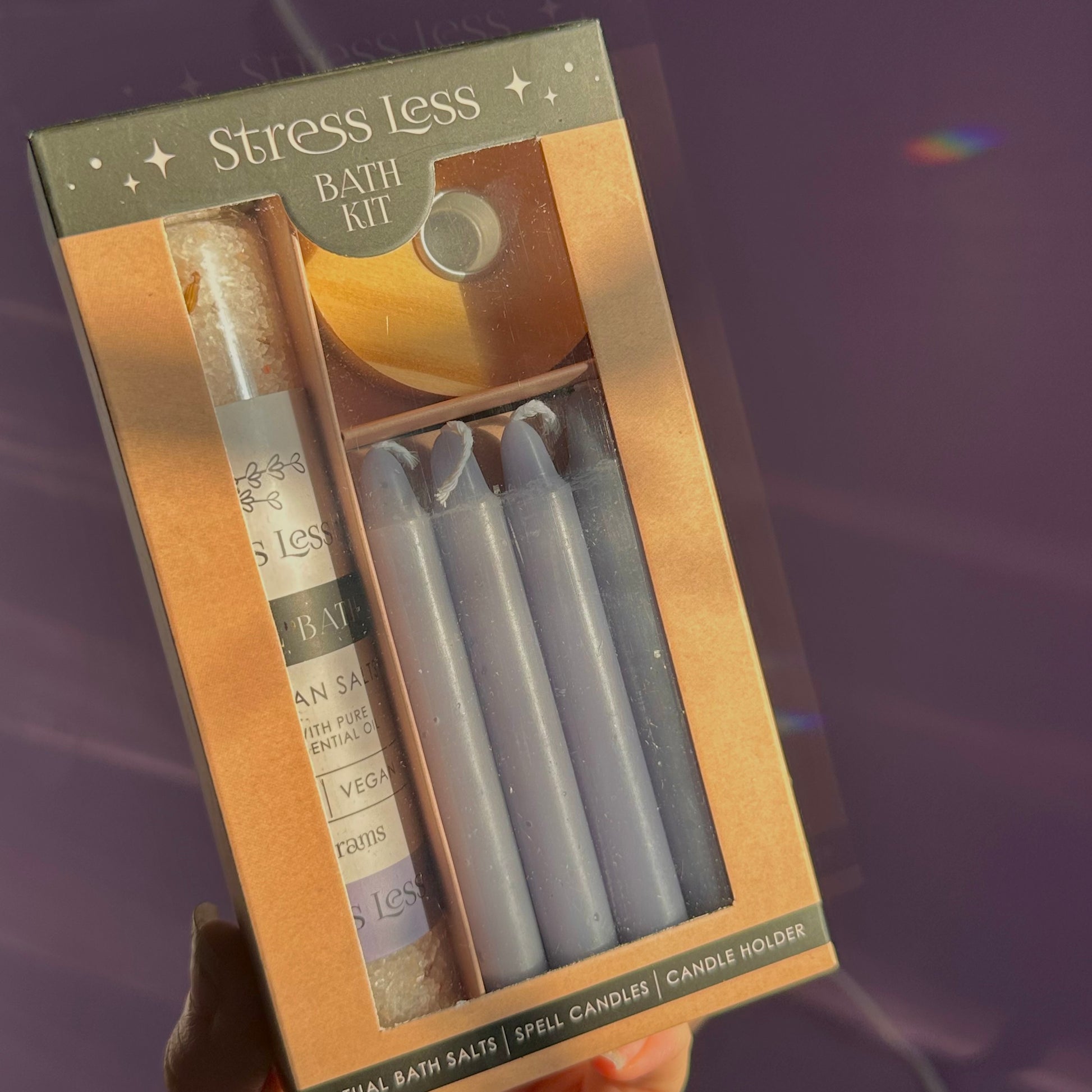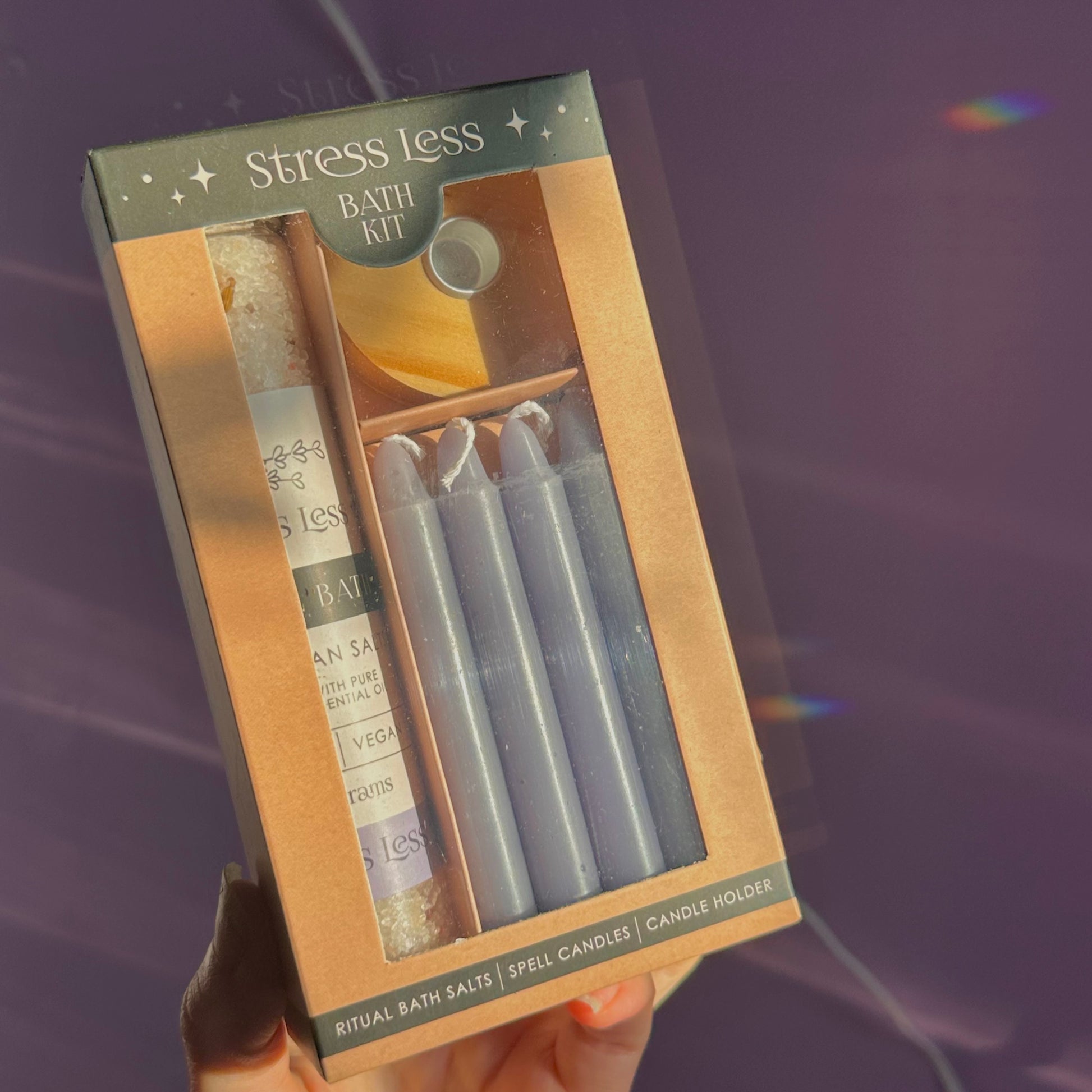 Alleviate stress and promote relaxation with the Stress Less Ritual Bath Kit. The kit features 100g of ritual bath salts, pack of 4 purple spell candles and a candle holder. The natural and vegan bath salts are made with Himalayan salt and infused with the comforting aroma of jojoba essential oil. Visualise a goal, light a purple spell candle, and manifest the end result while indulging in a relaxing bath.
