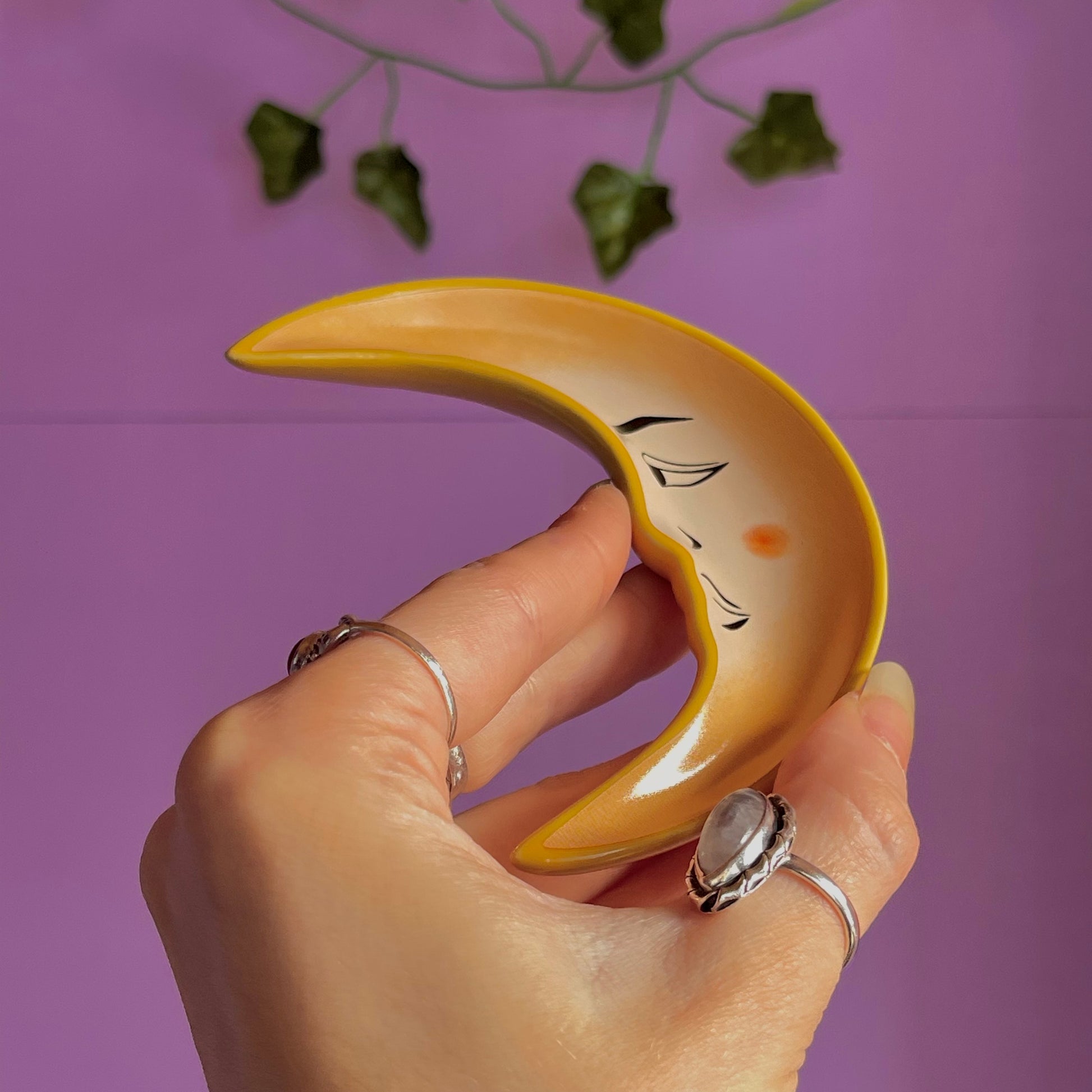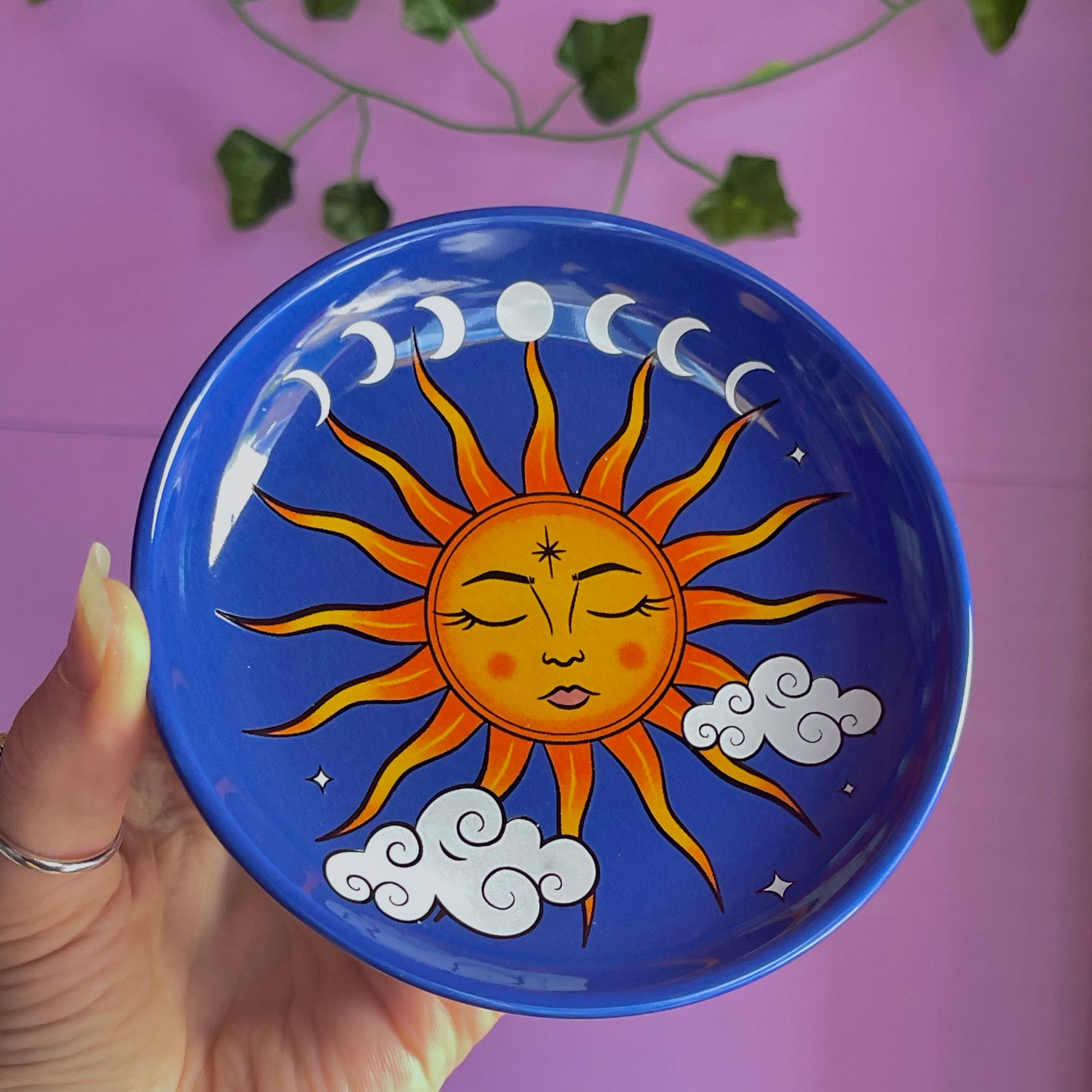 This circular ceramic trinket dish, adorned with a radiant sun design, doubles its charm with a crescent moon-shaped dish that stacks seamlessly on top. Perfect for organizing small treasures, the dual design adds a touch of cosmic magic to your space. A thoughtful and stackable gift, this celestial duo is a shining token for anyone who dreams under the stars.