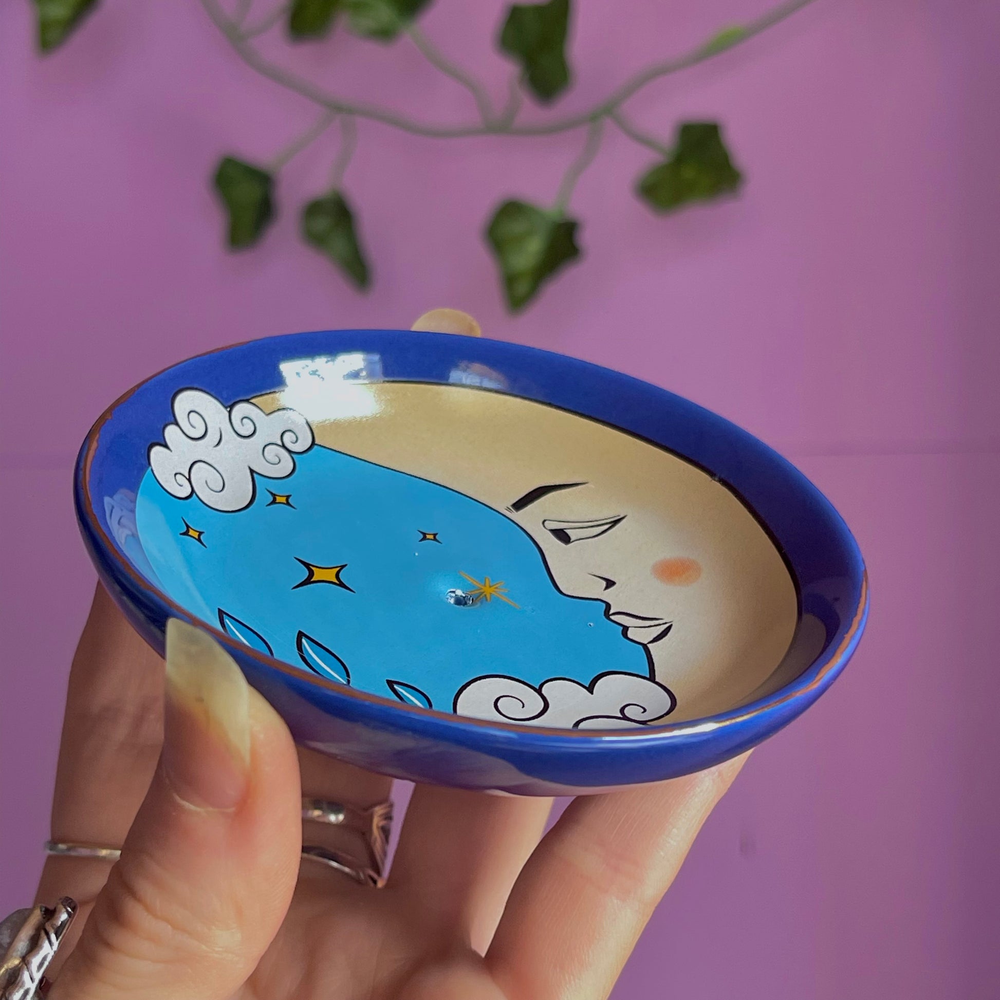 this modern incense stick holder features a blue moon design inspired by 'The Moon' tarot card; this ceramic dish provides a stylish and practical way to enjoy incense ~ simply place a smoking incense stick in the centre of the holder or use to store small trinkets on a vanity, altar or bedside table!