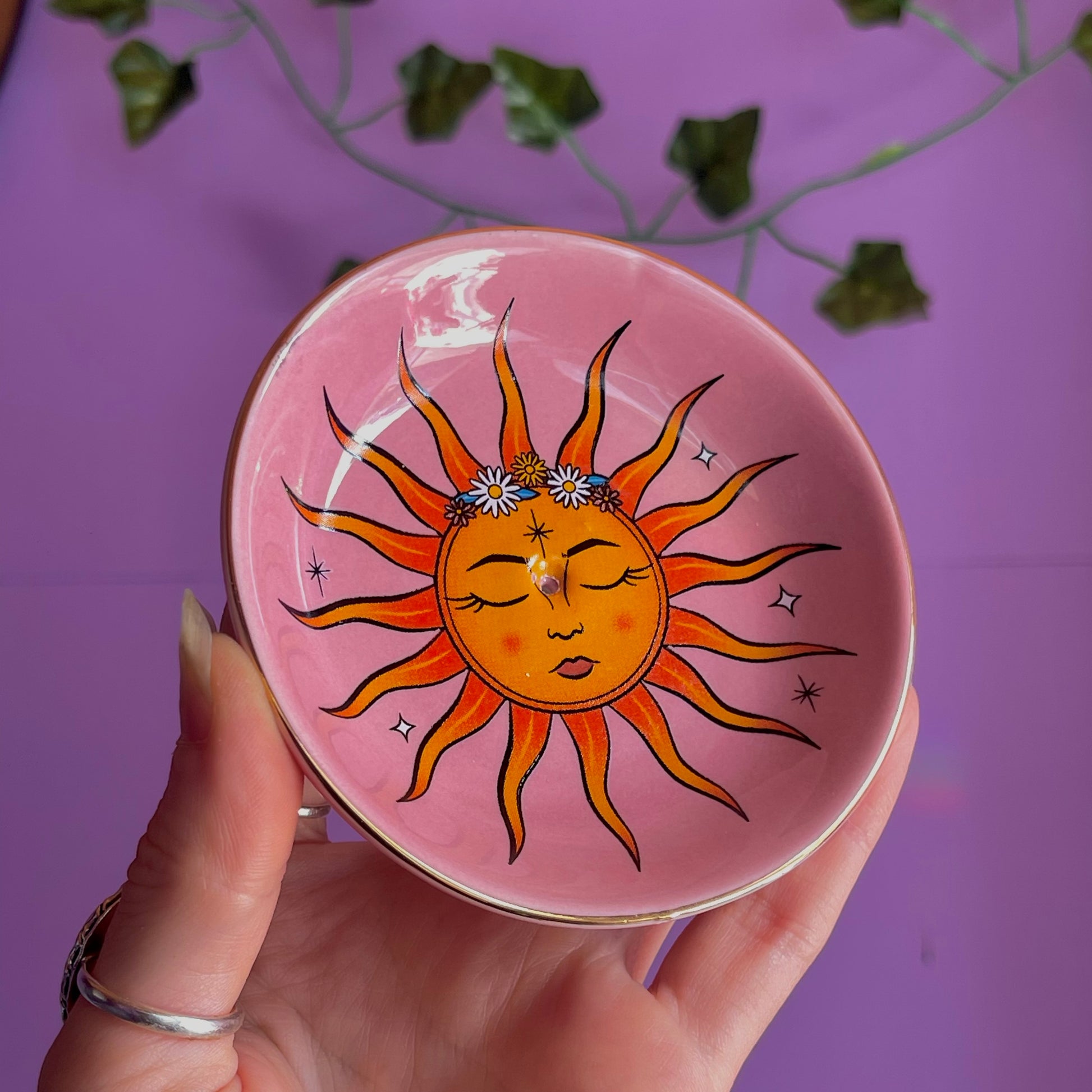 this modern incense stick holder features a colourful sun design inspired by 'The Sun' tarot card; this ceramic dish provides a stylish and practical way to enjoy incense~ simply place a smoking incense stick in the centre of the holder or use to store small trinkets on a altar, vanity or bedside table!
