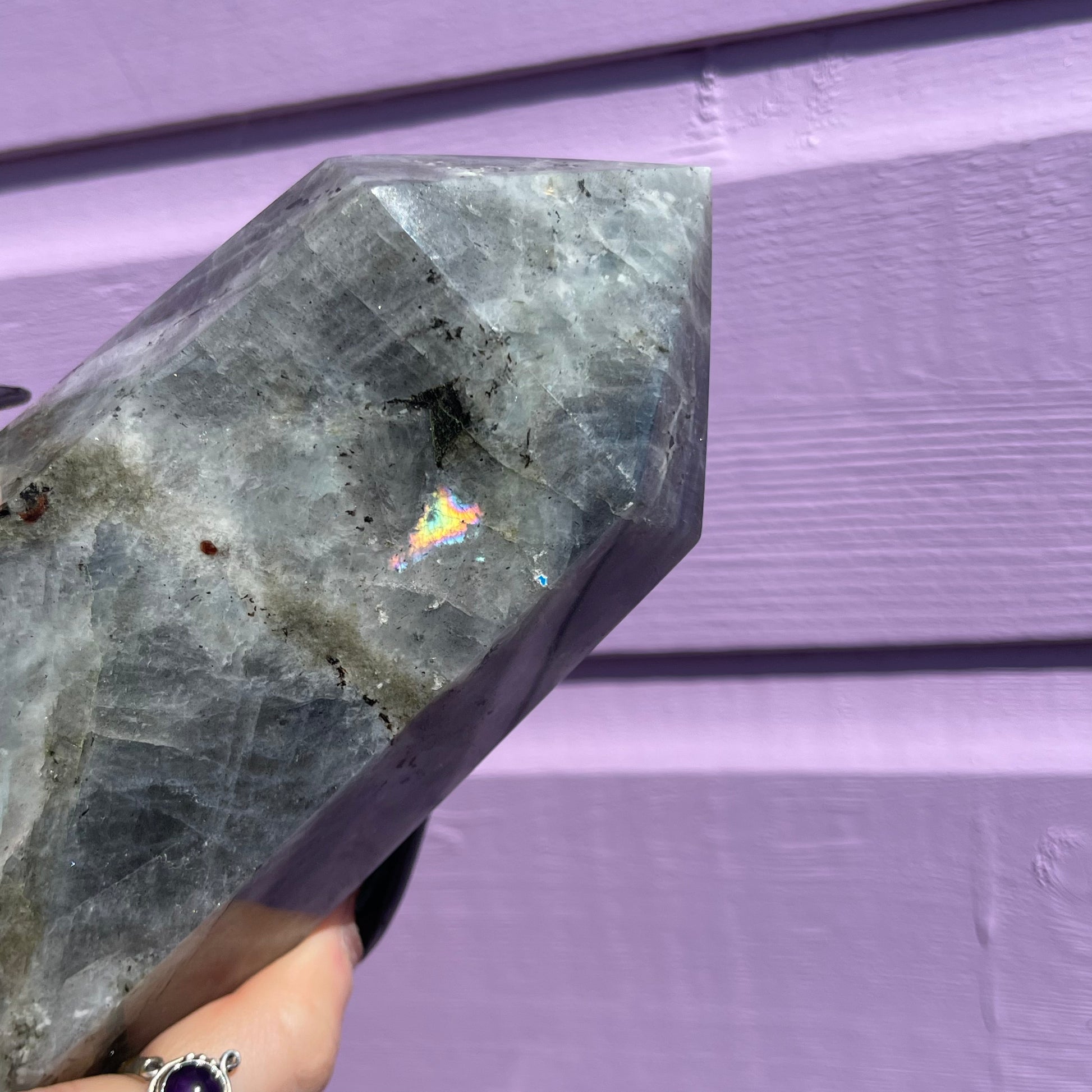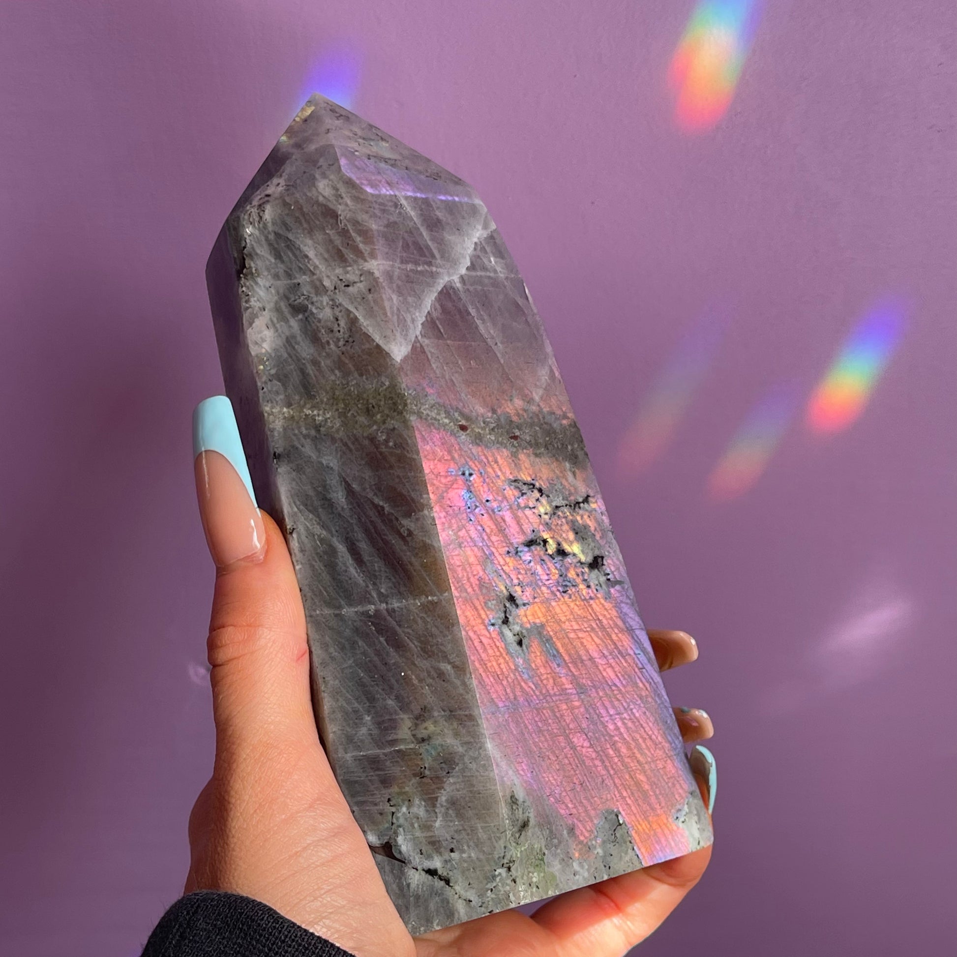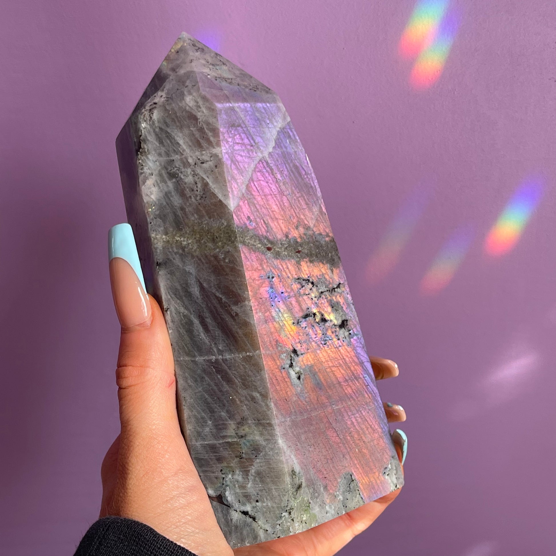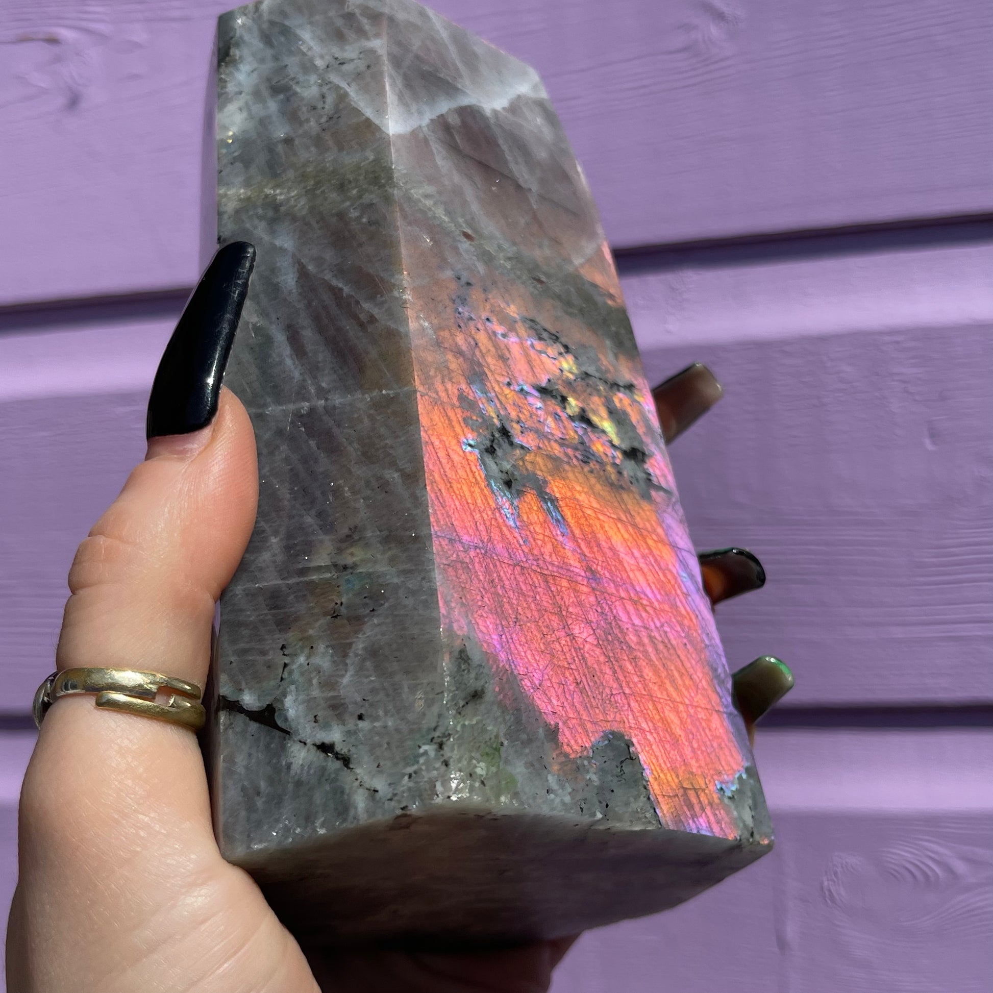 This tower is breathtaking, the sunset colour flashes are to die for, the front is covered in pinks, oranges, purples and blues as well as the sides and back having hints of insane little rainbow flashes, you could stare at this statement piece for hours. It is truly a unique and one of a kind labradorite piece. I can not get over how magical it looks in all angles and light.